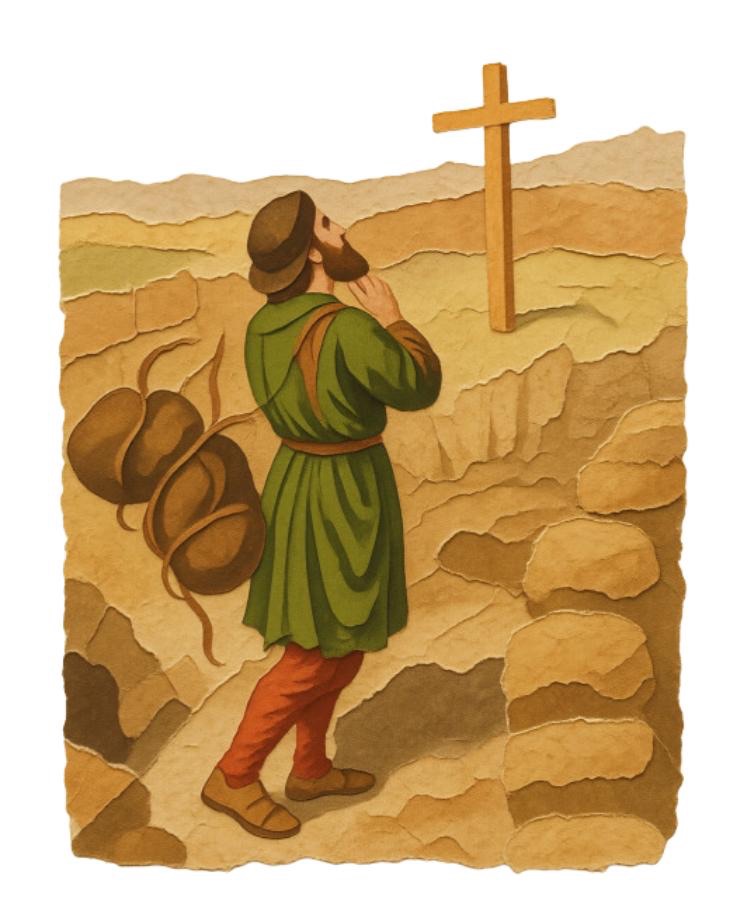 It was the picture of Christian in The Pilgrim’s Progress2 running toward the cross with a heavy burden strapped to his back. And then, as he reaches the cross, the burden suddenly loosens as the straps holding it to his back snap; it falls off and rolls away into the empty tomb at its foot.